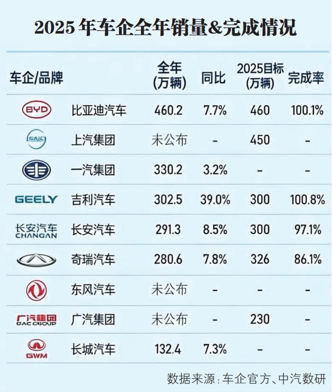 2025年的这份成绩单中,有460万辆的比亚迪,有302万辆的祥瑞,有291万辆的长安,有280万辆的奇瑞……