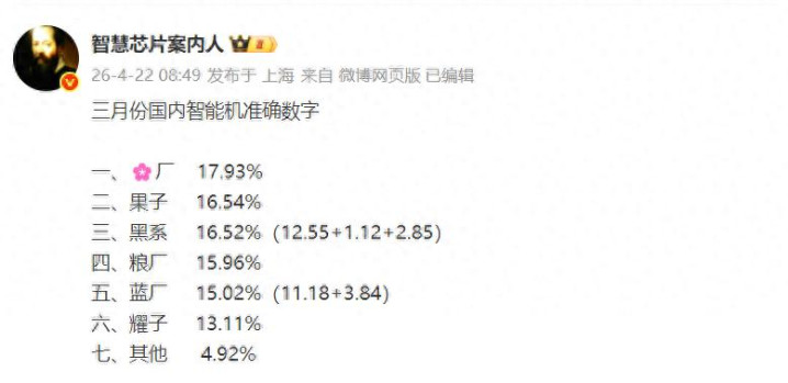 这是行业东谈主士“智谋芯片案内东谈主”在4月22日提供的,2026年3月份国内智高东谈主机限制名次数据。左证他提供的数据,名次如下:
