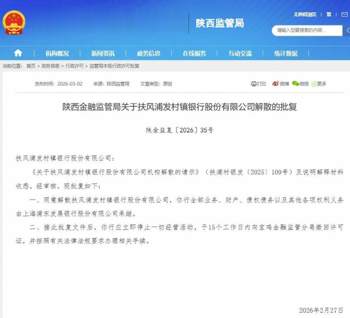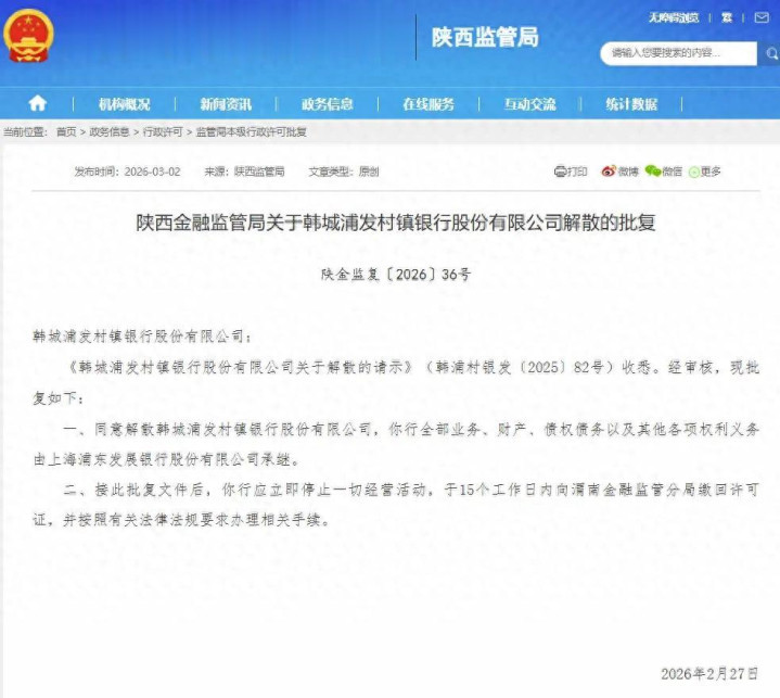 2026 年 3 月 2 日,国度金融监督处治总局陕西监管局、贵州监管局接踵发布行政许可批复,喜悦韩城浦发村镇银行股份有限公司、扶风浦发村镇银行股份有限公司、黔西南义龙浦发村镇银行股份有限公司三家机构驱散,其一齐考虑业务、财富欠债及职权义务均由上海浦东发展银行股份有限公司(下称 “浦发银行”)全面承继。