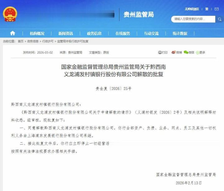 黔西南义龙浦发村镇银行的驱散央求则由国度金融监督处治总局贵州监管局批复,批复文号为贵金复 (2026) 25 号,批复日历为 2026 年 2 月 13 日。该批复明确,机构驱散后,其一齐财富、欠债、业务、网点、职工偏激他一切职权义务由浦发银行承继,机构需立即罢手谋划活动,于 15 个使命日内向黔西南金融监管分局缴回许可证,并依规完成后续手续办理。