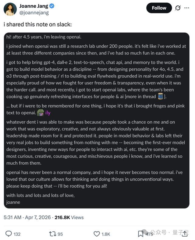 刚刚,「4o之母」Joanne Jang发了一篇长文,晓示搁置我方在OpenAI四年半的旅程。