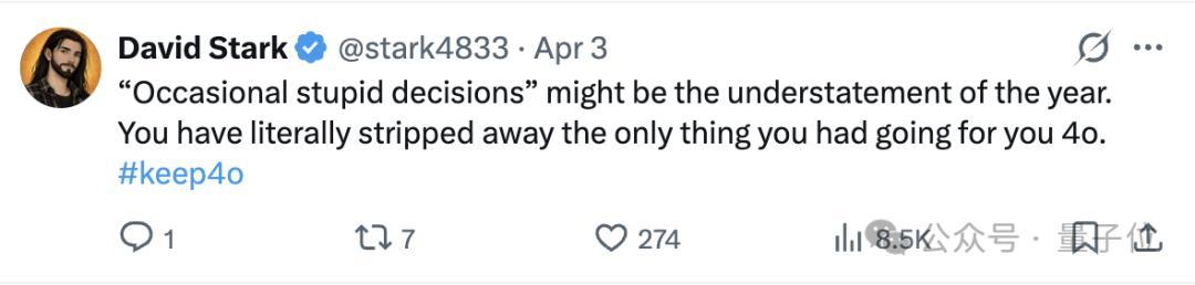 事实上,即便在4o下线之后,寰球还一直在奥特曼的挑剔区抗议,带上Keep4o的标签。一个紧迫原因就是寰球心底还存着一点丝幻想。