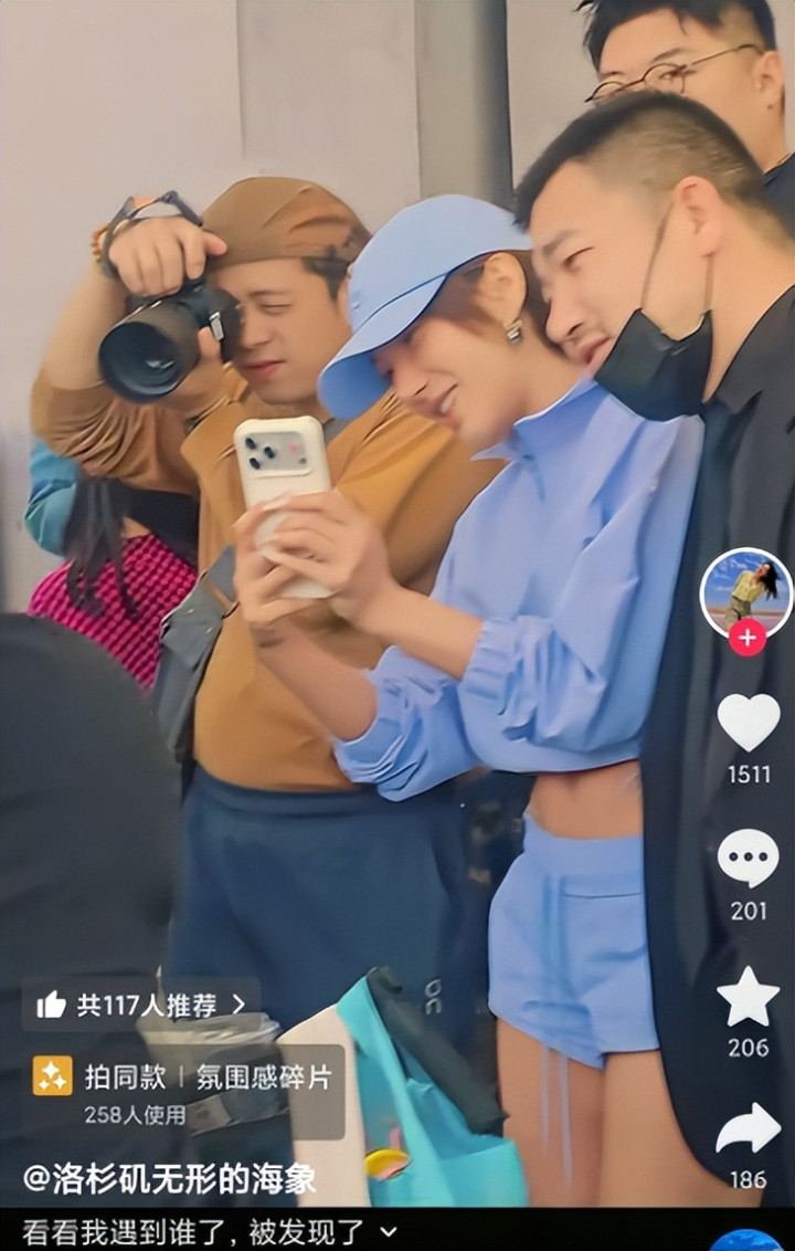 被拍到的年青女性身着蓝色短款露脐套装,搭配从简配饰,穿搭新潮吸睛。