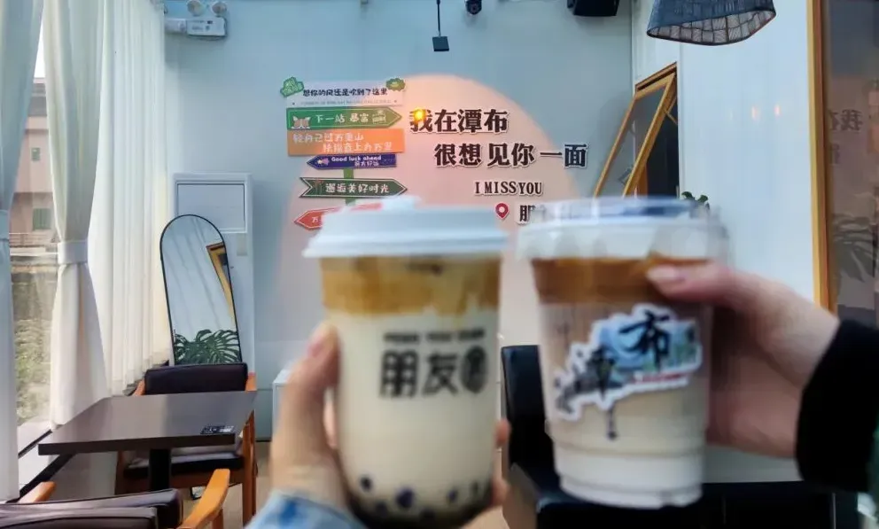 饮品杯身印有“潭布”等特质字样。