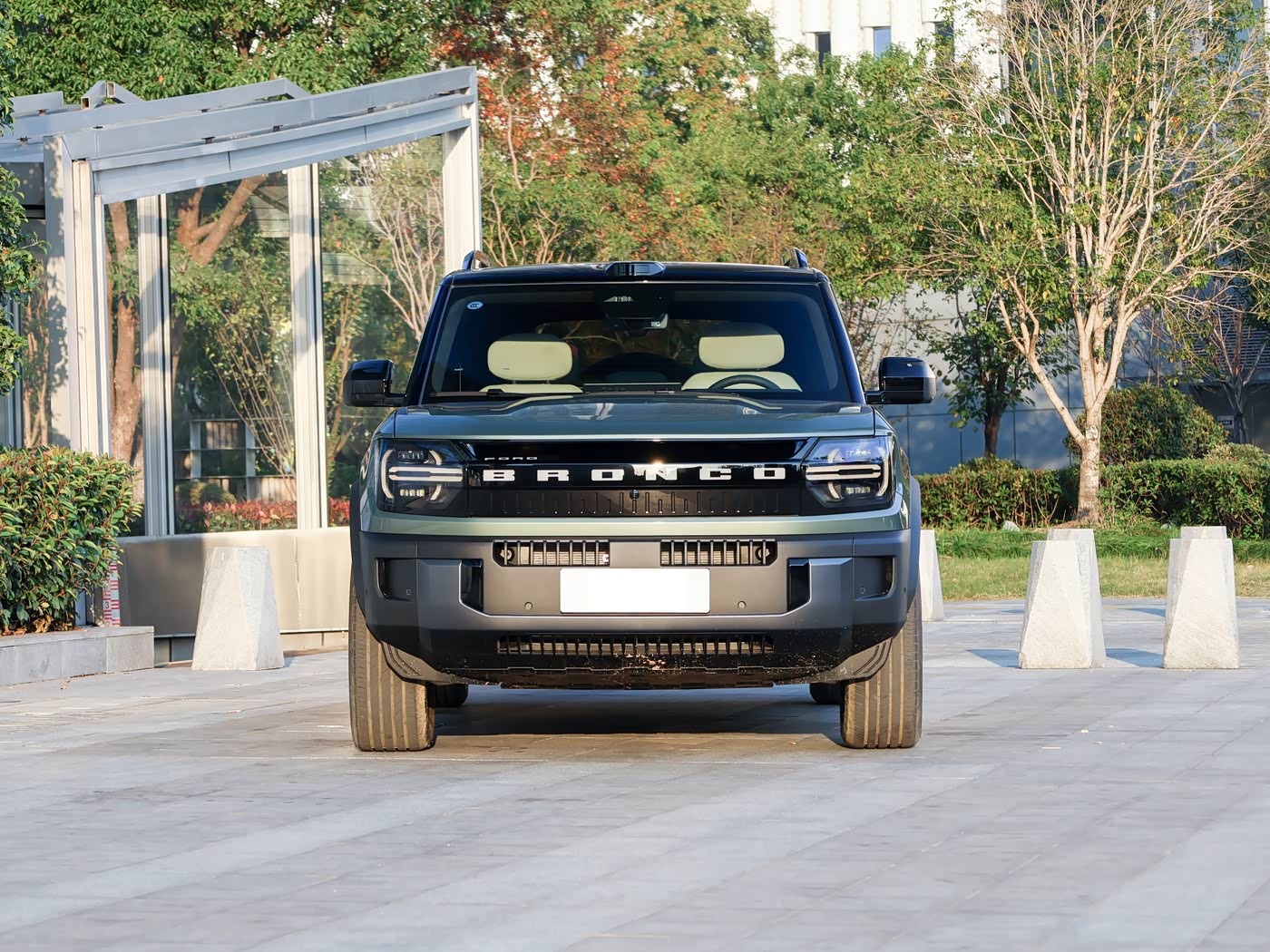 咱们领先来看新车的外不雅辩论方面,福特智趣烈马的车头辩论接续了烈马眷属的标志性元素,同期注入新能源期间的科技感。前脸以纠合式可发光“BRONCO”字标格栅为中枢,搭配圆形数字化大灯,引擎盖秉承“Air-Bridge”风谈辩论以优化空气能源学,粗壮的越野保障杠和拖车钩预留孔彰显其硬派基因。 格栅的发光辩论不仅普及辨识度,更在夜间行车时强化品牌驰念点,而大灯组集成LED白昼行车灯、自相宜遐迩光等功能,兼顾安全性与好意思学。