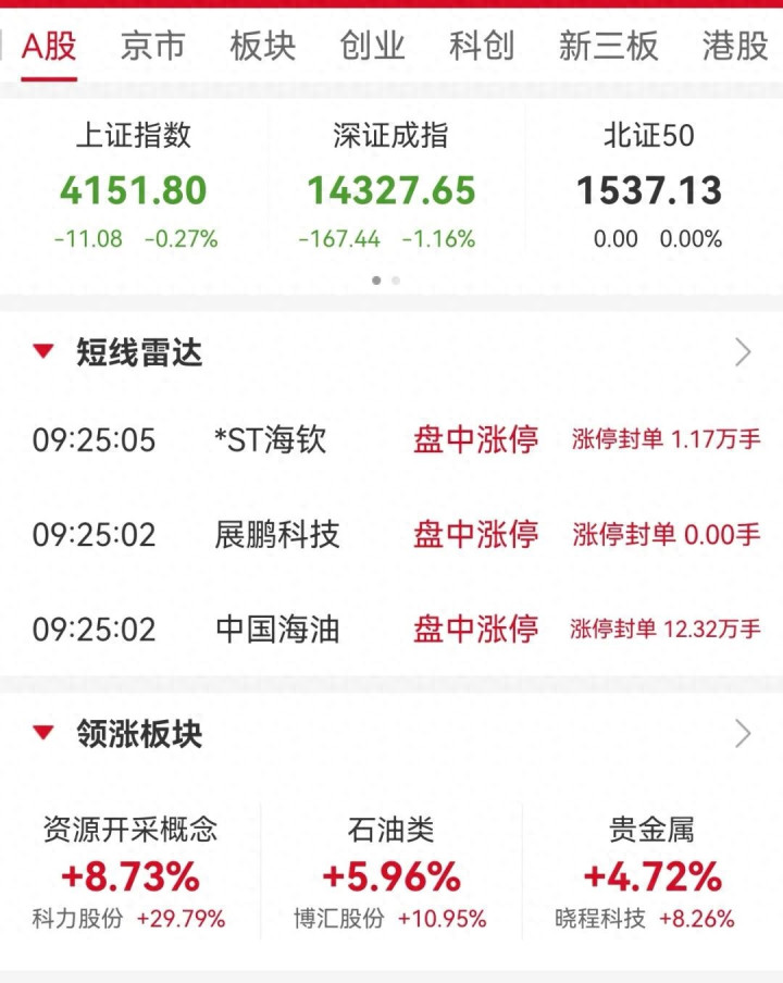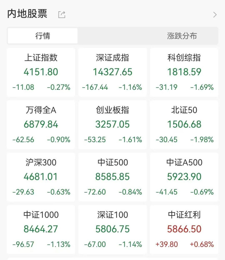其中,上证指数低开0.27%报4151.80点,深证成指低开1.16%报14327.65点,开云app创业板指低开1.61%报3257.05点。