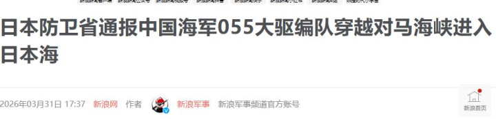 新浪军事2026-03-31日本驻守省通报中国舟师055大驱编队穿越对马海峡干涉日本海