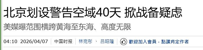中国时报2026-04-07北京划设劝诫空域40天 掀战备疑虑